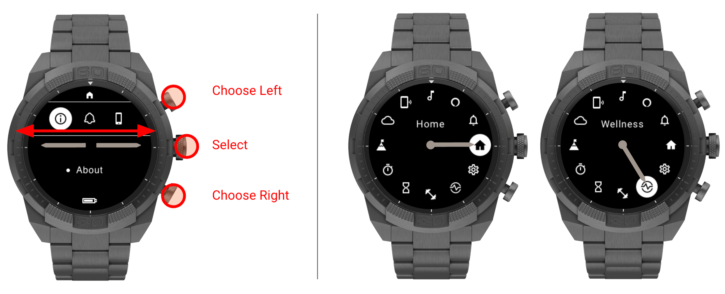 Noting the interaction discrepancy, I made sure the visual and navigational overhaul also aligned physical inputs with digital feedback. By implementing contextual UI markers next to hardware buttons, I maximized screen real estate while improving function comprehension and discoverability. Additionally, I standardized the center crown as a universal 'Home' button, directly addressing user feedback regarding menu fatigue and navigation traps.