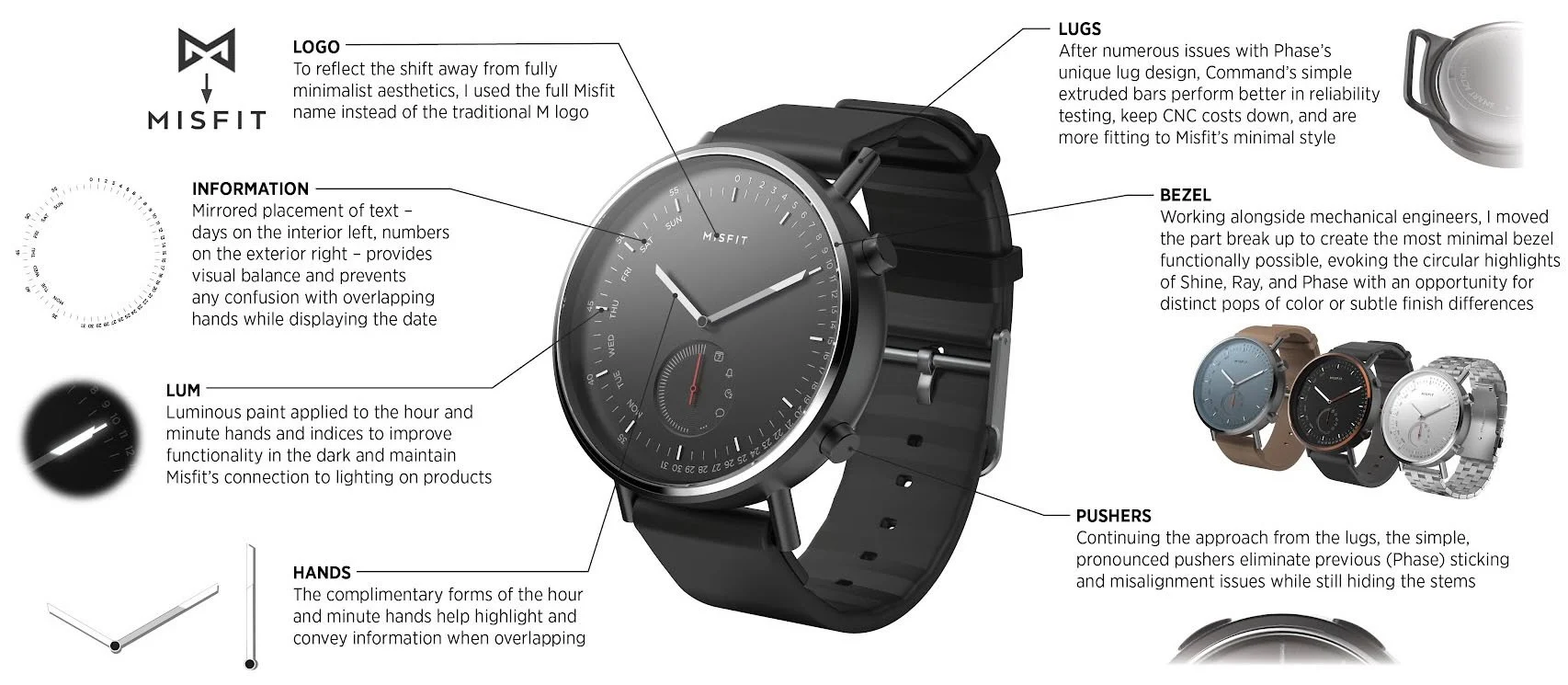 Misfit Command garnered significant attention for its comprehensive interface given the simple controls, receiving 2 style refreshes after release. In addition, the “atypical” method of day/date communication became the standard approach across Fossil Group for hybrid analog watches.